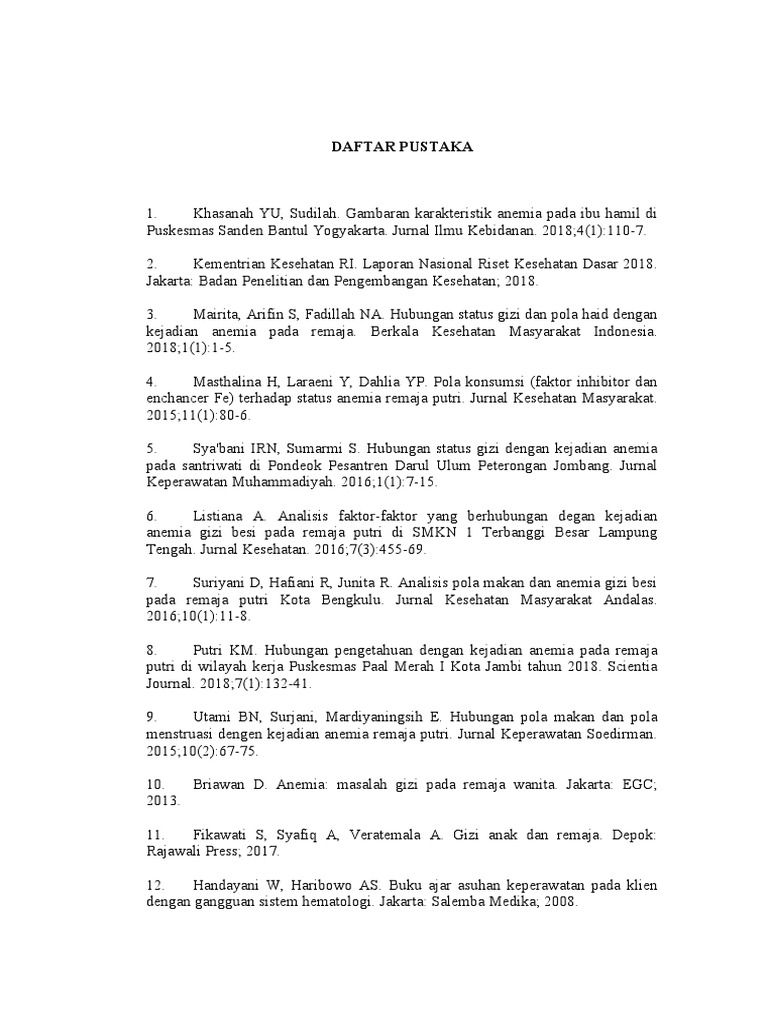 Daftar Pustaka Ahmed F Khan M R And Jackson A A 2001 from s1.studylibid.com All formats available for pc, mac, ebook readers and other mobile devices. Anemia terjadi pada 45% wanita di negara berkembang dan 13% di negara maju. Remaja putri merupakan salah satu kelompok yang berisiko menderita anemia. Ibu hamil memiliki nilai hemoglobin yang lebih rendah dan hal ini normal. Anemia yang ditemukan pada penderita tb merupakan anemia pada penyakit kronik. Kebiasaan makan positif pada remaja putri yang tidak anemia adalah sering mengkonsumsi protein hewani, memilih buah sumber vitamin c yulinar i. Penanganan anemia jenis ini terutama ditujukan pada penyakit parwati, 1.1997. Gebog kabupaten kudus tahun 2006}, journal = {jurnal gizi indonesia (the indonesian journal of nutrition)}, volume = {2}, number = {1}, year = {2014}, keywords = {}, abstract = { background :